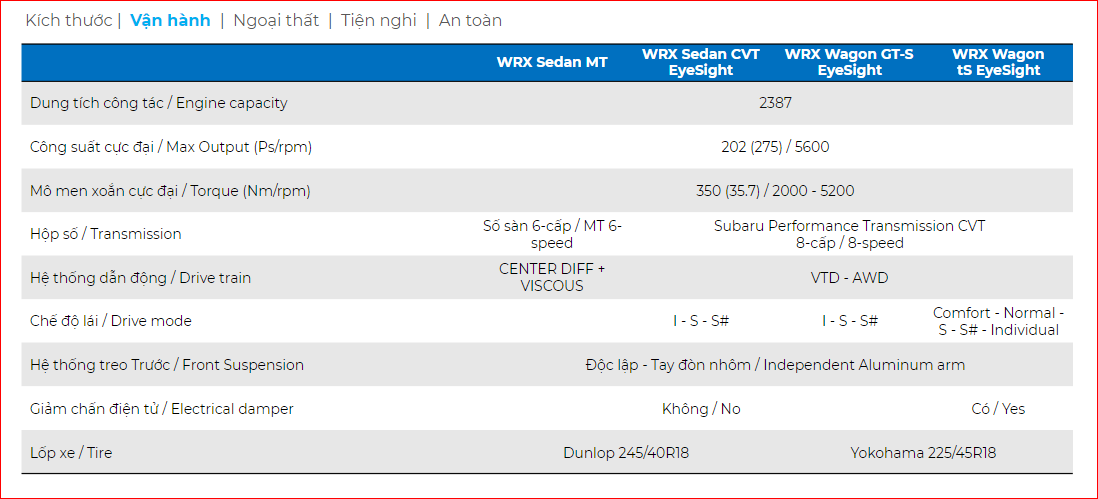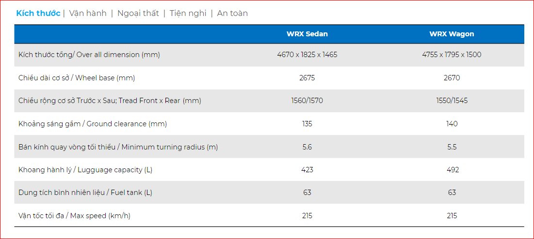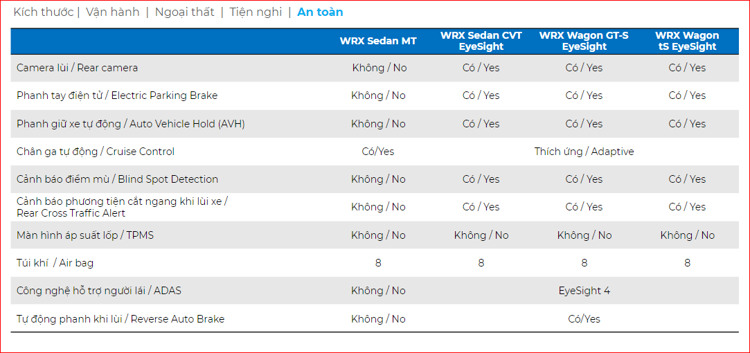 - Cái tên Subaru WRX ra mắt năm 1992 để tham gia giải đua xe thế giới. Ngoài việc củng cố triết lý của SUBARU về "Hiệu năng lái xe cuối cùng là để đảm bảo an toàn", Nhiều đổi mới công nghệ đã tăng cường sự an toàn trong các tình huống lái xe thực tế trong suốt lịch sử đã làm cho WRX trở thành tài sản của Subaru.